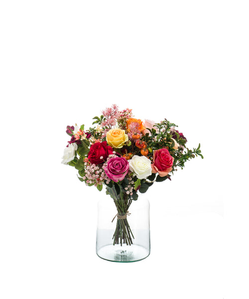 Dit boeket kenmerkt zich door de prachtig gekleurde rozen. Tussendoor vind je groen blad en besjes terug. Dit volle boeket behoudt het hele jaar door zijn prachtige kleuren en heeft geen water nodig. Hierdoor geniet je het gehele jaar door van een kleurrijk bloemstuk in je interieur.