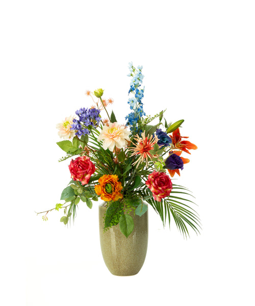Dit is een krachtig boeket waarin verschillende bloemsoorten en vormen zijn verwerkt voor een speels effect.