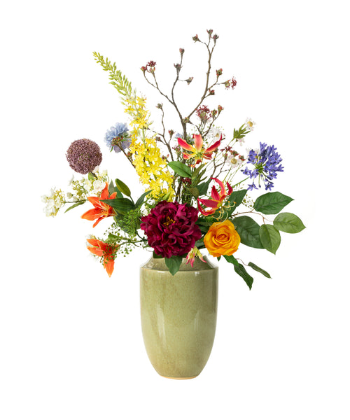 Dit boeket heeft door de diversiteit aan exclusieve bloemen een luxueuze uitstraling. Dit boeket blijft het hele jaar mooi en heeft geen onderhoud nodig. Een ware flower bomb!